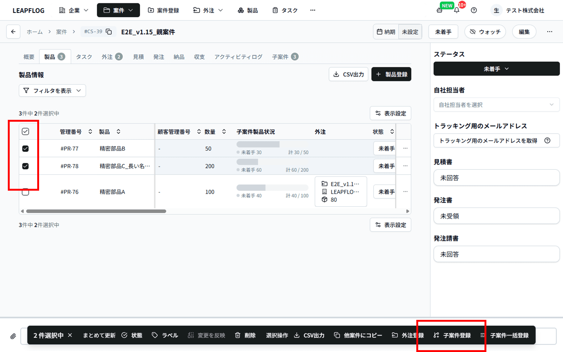 ポイント: 同じ手順で複数製品を選択すると「子案件一括登録」ボタンも利用できます。複数の子案件をまとめて作成する場合は「子案件を一括登録する」を参照してください。