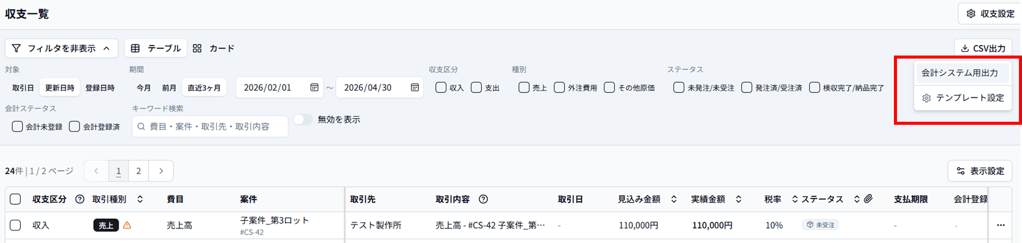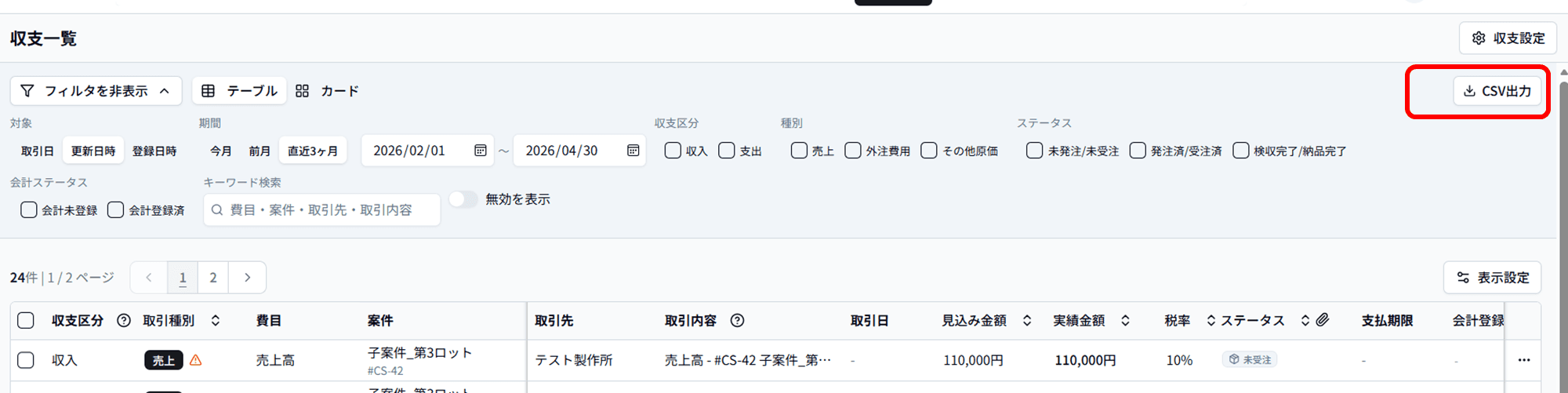 - 必要に応じて期間・取引種別・ステータスなどで絞り込みます(絞り込み方法は「収支一覧で取引を一覧する」を参照)