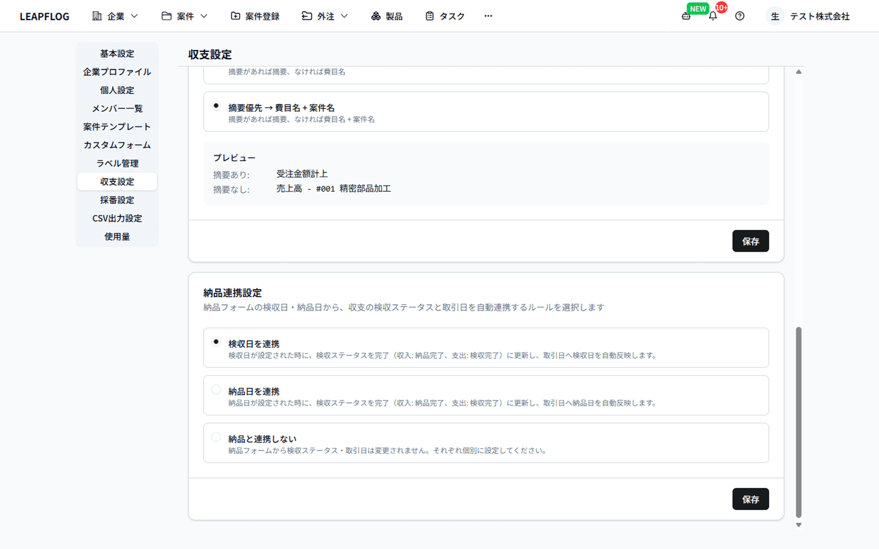 | 納品と連携しない | 納品フォームから収支は変わりません。検収ステータス・取引日は個別に設定 | 納品と会計を分けて管理したい場合 |