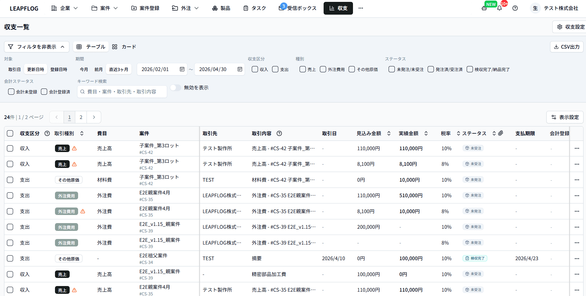全案件の取引を横断的に一覧し、日付・ステータス・費目などで絞り込みや一括操作を行います。